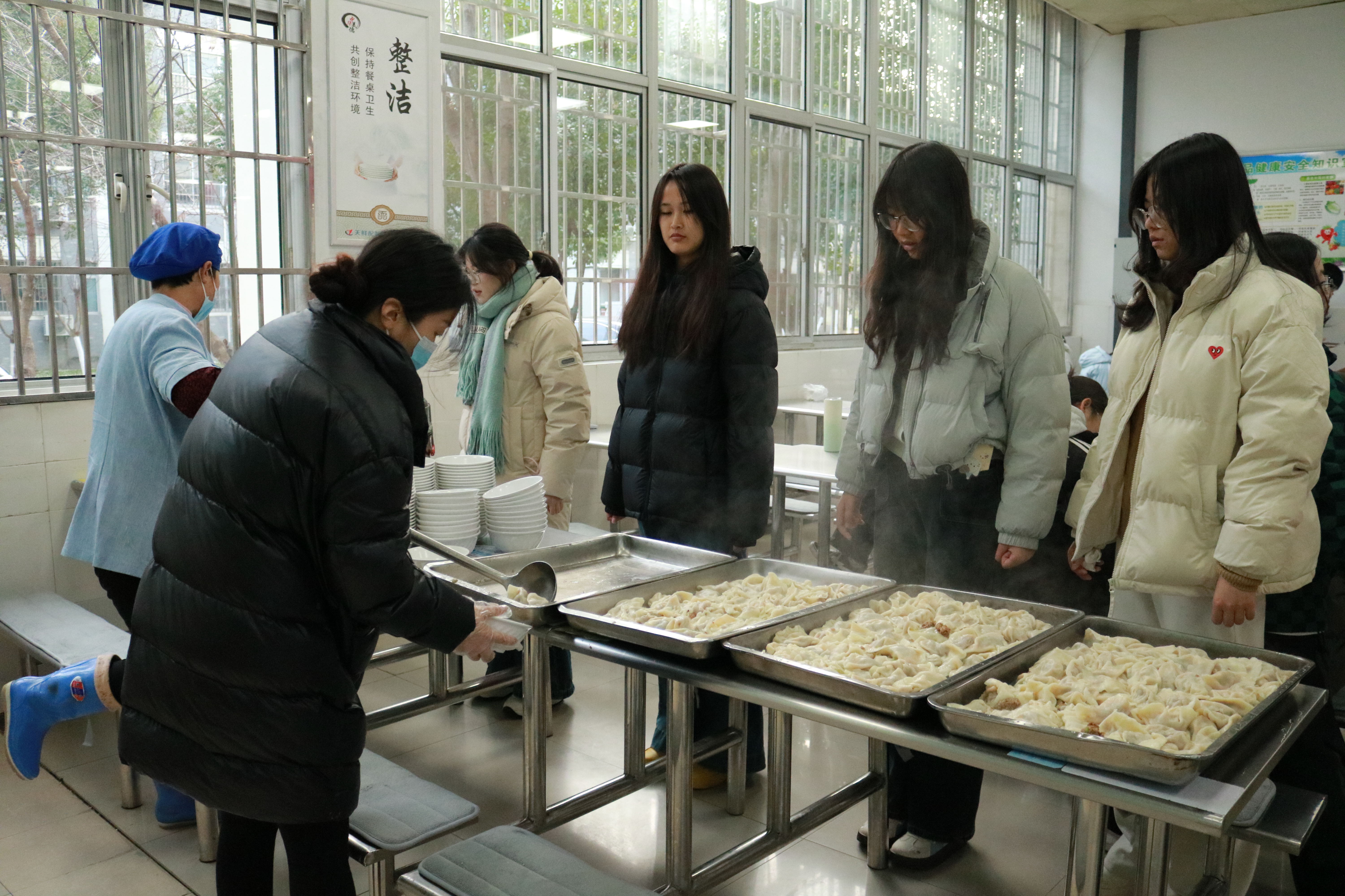 活动现场热闹非凡,参与学生凭报名信息签到后,领取围裙、手套等工具在指定工位就位。食堂阿姨也热情参与进来,全程指导同学们完成包饺子的每一步操作。大家围站在桌前,分工协作、默契配合,有的同学手法娴熟,包出的饺子圆润饱满;有的同学初次尝试,饺子造型虽略显稚嫩,却满是创意。欢声笑语里,一张张饺子皮在指尖变成形态各异的饺子,食堂内处处洋溢着温馨的节日氛围。当热腾腾的饺子端上桌,同学们品尝着自己亲手包的饺子,暖意从舌尖直达心底。